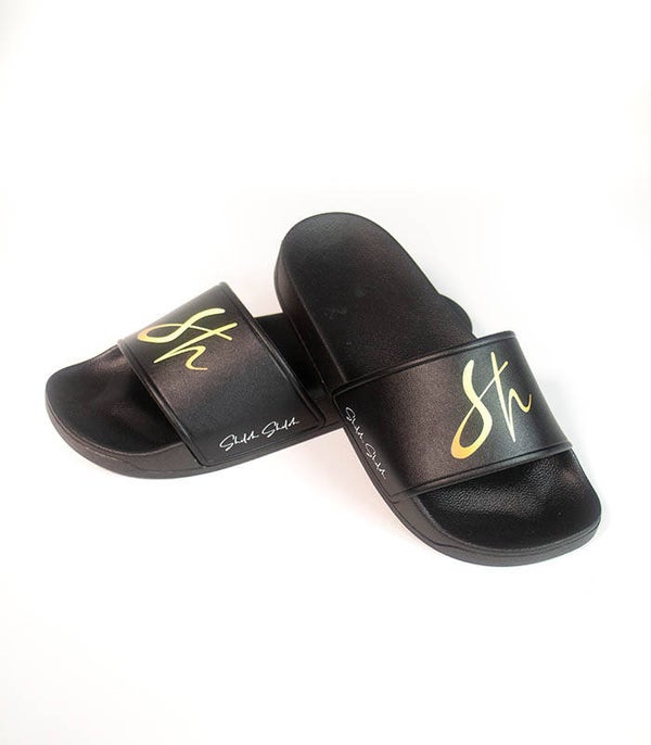 Zwarte slippers met de letters SH of het logo op de voorkant en aan de zijkant “Shiloh Shiloh’’.